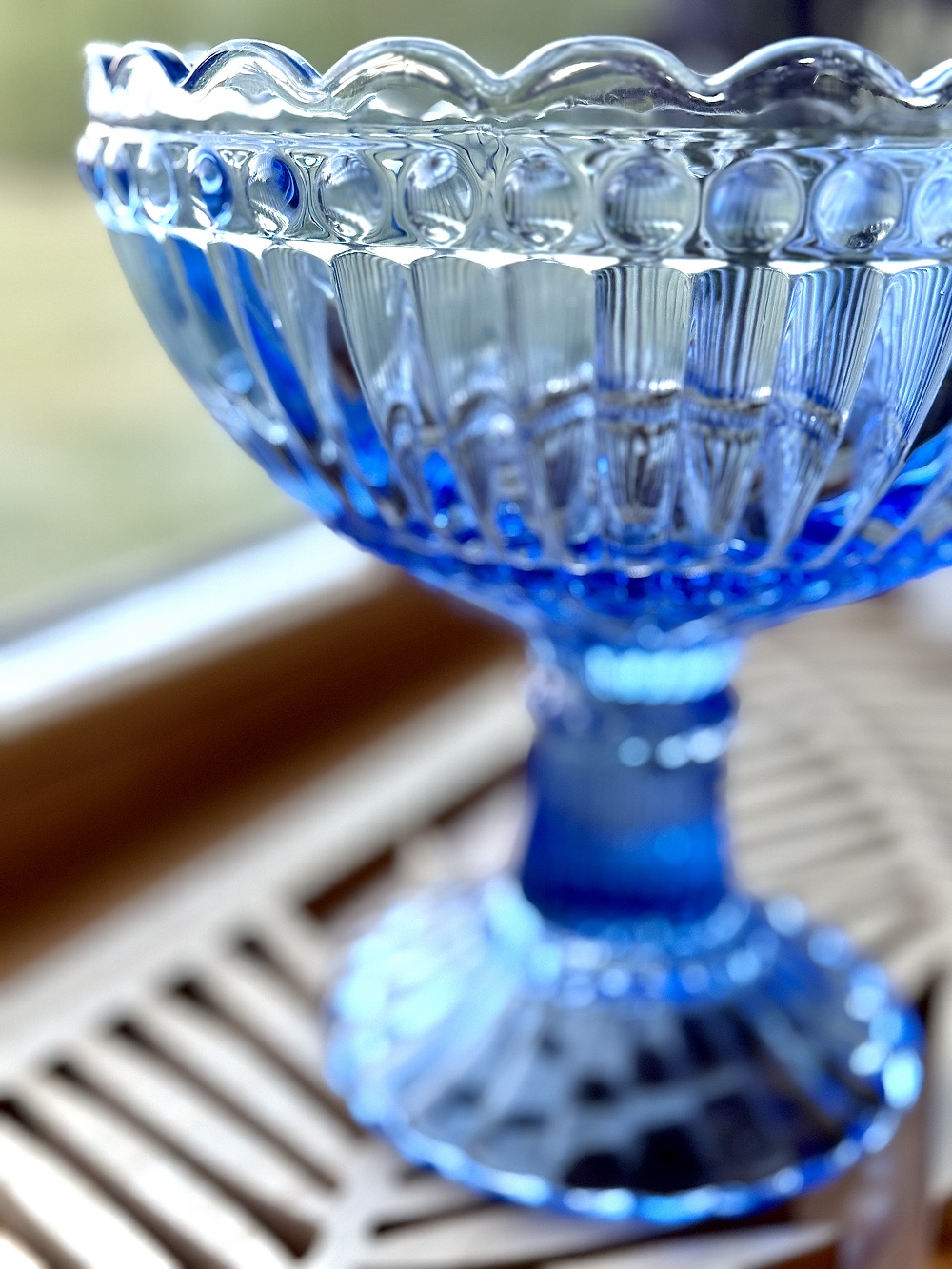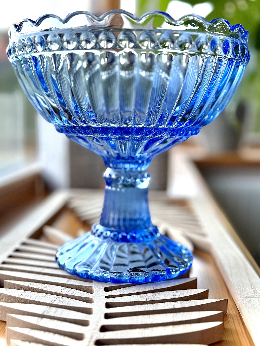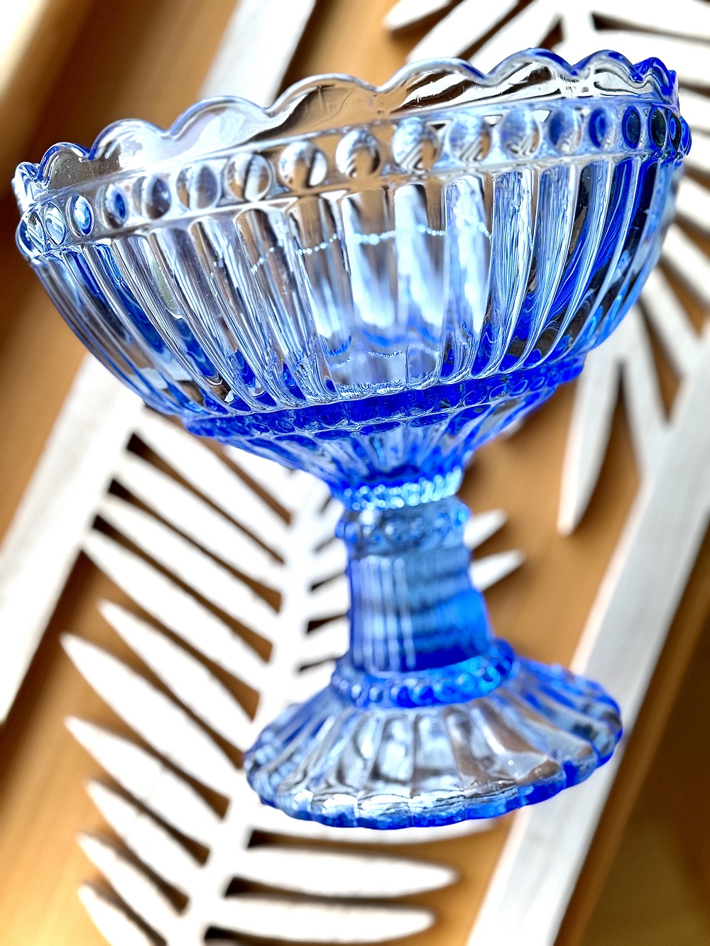 Vintažinis, didelis, spalvoto stiklo dubuo ant kojos.